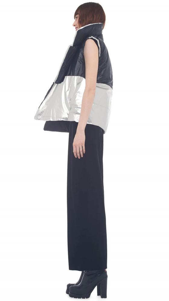 The Sleeping Bag Coat is one of the classic icons of the Norma Kamali brand. Originally designed in 1973, the Sleeping Bag Coat created a frenzy among fashion-hungry style seekers. It remains as relevant and chic today as it was back then. Using the NASA method for warmth, each coat is actually two coats sewn together with air pockets in between. Heat from the body exchanges with the cold from outside.SPLICED REVERSIBLE SLEEVELESS SLEEPING BAG VEST Reversible Sleeveless Wide notched lapels Malleable high collar Self-tie belt Comes with storage bag Length: 22″ Made in USA Have a question You may find an answer in our FAQs. FABRIC Nylon and Ripstop.Composition: 100% nylon. 100% polyester. 100% polyester fill. CARE INSTRUCTIONS For the long life of this style, please follow the directions: sponge clean. Never dry clean. Clean before storing. Roll up like a sleeping bag and store in storing bag as a space saving method.