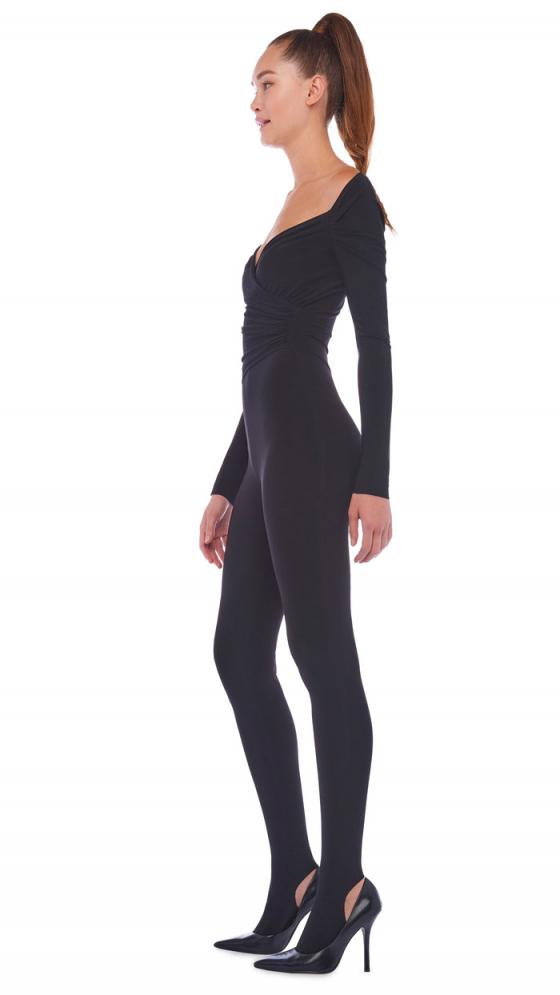 LONG SLEEVE SWEETHEART CATSUIT WITH FOOTIE Long sleeves Sweetheart neckline Shirred sides Slim leg Stirrup foot Have a question You may find an answer in our FAQs. FABRIC 4-way stretch Poly Lycra.Composition: 95% polyester 5% spandex CARE INSTRUCTIONS For the long life of this easy care style, please follow the directions: hand wash cool water, line dry, do not dry clean.