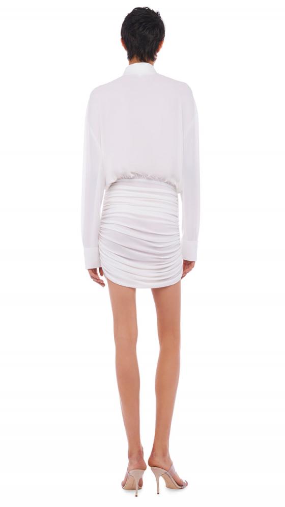 OVERSIZED BF NK SHIRT SHIRRED BOTTOM MINI DRESS Long sleeves Bonded collar Attached shirred skirt Have a question You may find an answer in our FAQs. FABRIC 4-way stretch Poly Lycra.Composition: 95% polyester 5% spandex CARE INSTRUCTIONS For the long life of this easy care style, please follow the directions: hand wash cool water, line dry, do not dry clean.
