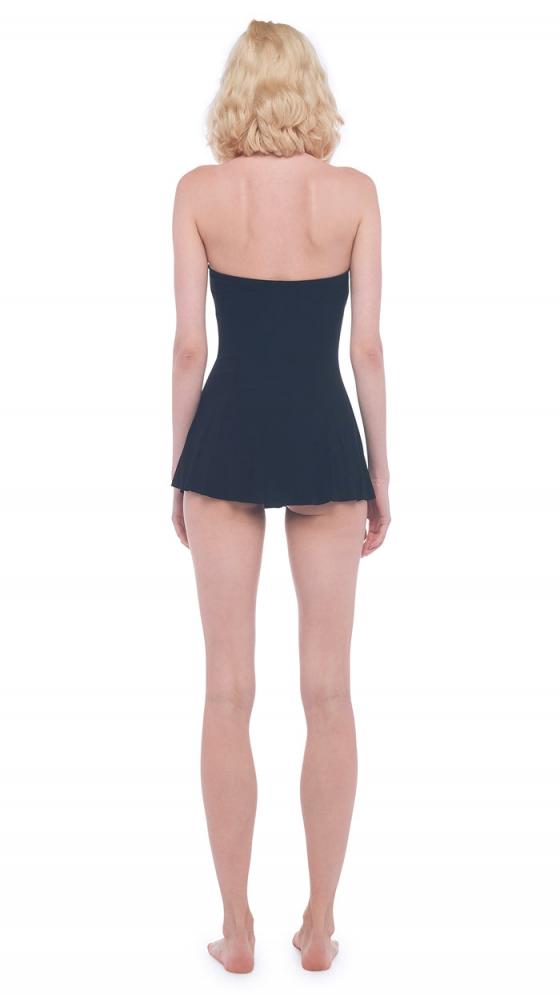 STRAPLESS FLARED SWIM DRESS One piece Strapless Lightly pleated skirt Attached brief with full seat coverage Protective adhesive strip must remain in garment to be eligible for refund Have a question You may find an answer in our FAQs. FABRIC 4-way stretch Poly Lycra.Composition: 95% polyester 5% spandex CARE INSTRUCTIONS For the long life of this easy care style, please follow the directions: cold water wash, cool dry line dry, do not dry clean.